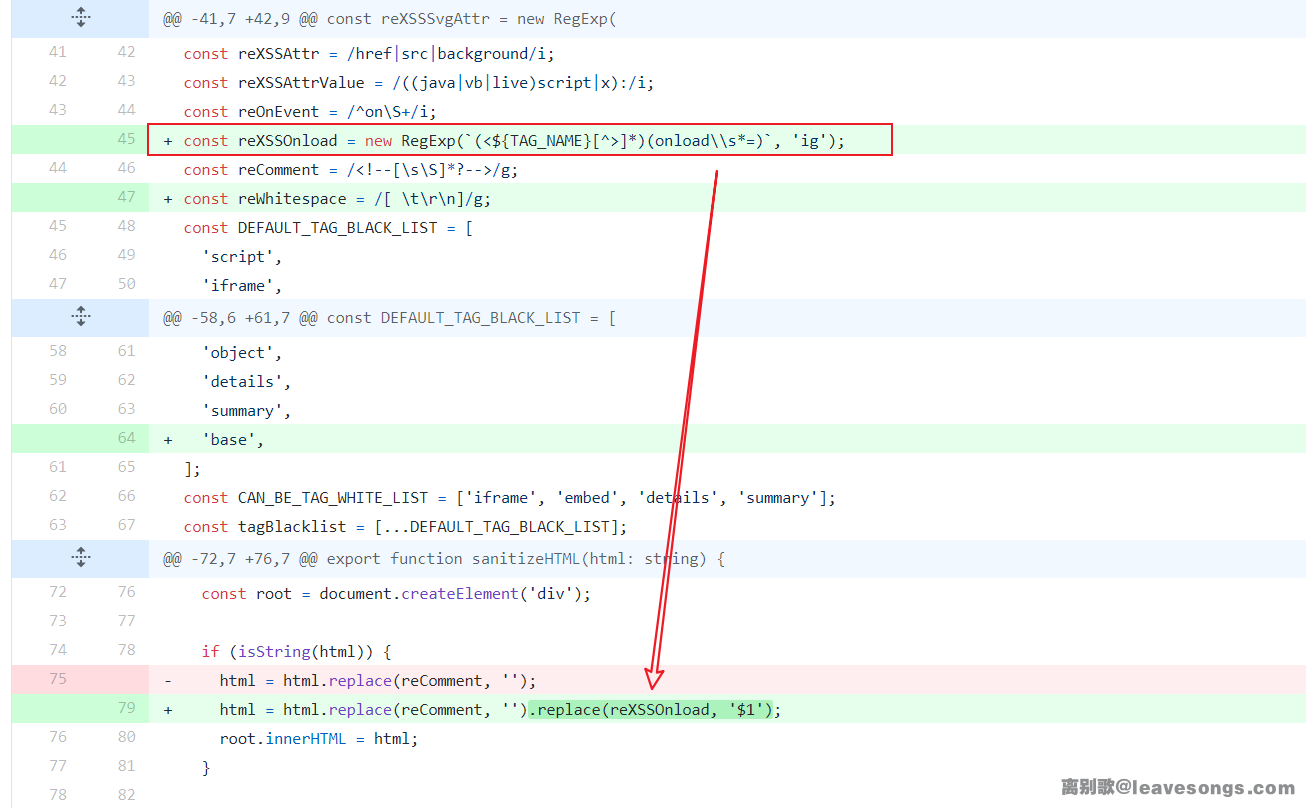 这个时候我开始翻history,我发现就在不到一个月前,Tui Editor曾对HTML sanitizer进行了修复,备注是修复XSS漏洞,代码改动如下: