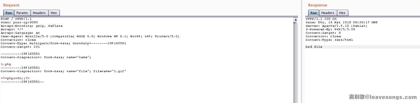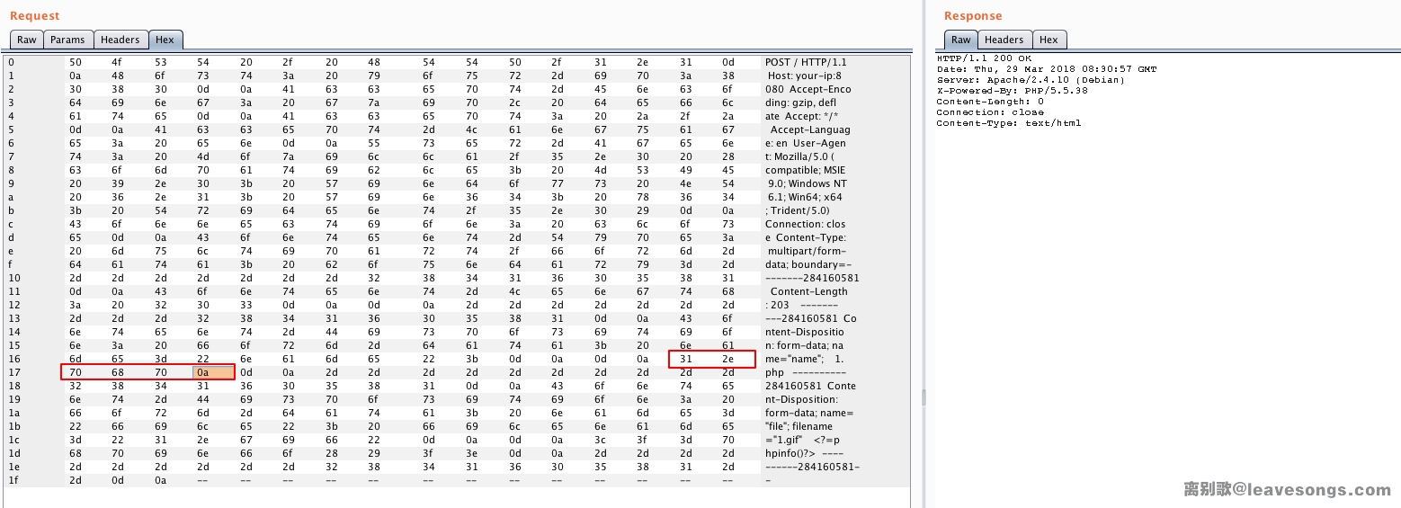 $_FILES['file']['name'],因为他会自动把换行去掉,这一点有点鸡肋 - 默认的Apache配置即可利用,因为默认Apache配置就使用了