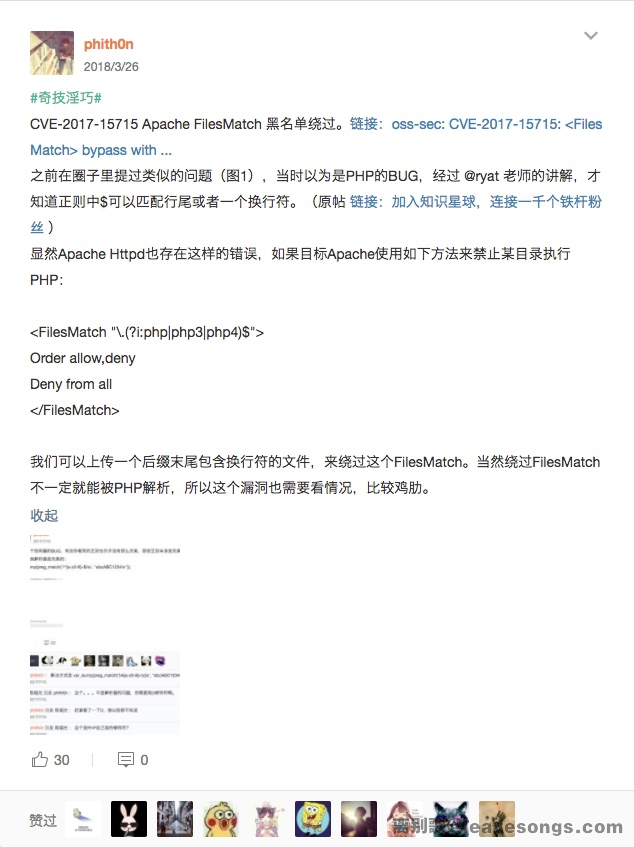 所以理论上,只要用正则来匹配后缀进行php解析的Apache就有这个问题。而这个做法刚好是为了解决Apache老的解析漏洞而做的,可谓非此即彼,必然存在一种解析漏洞。
