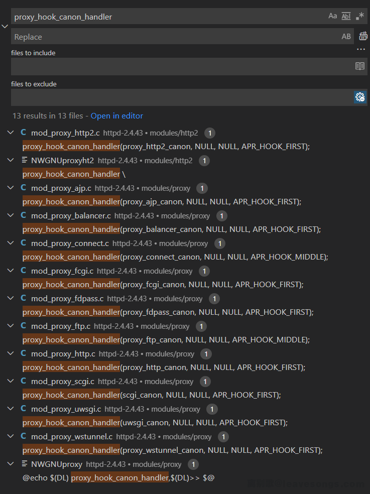 可以看到,每一个mod_proxy_xxx都会注册一个自己的canon handler,canon handler会在反代的时候被调用,用于告诉Apache主程序它应该把这个请求交给哪个处理方法来处理。