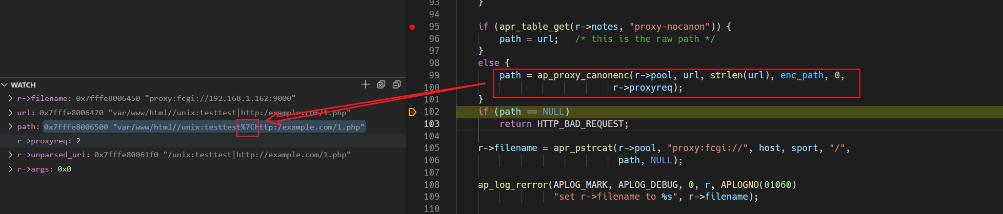 经过调试可见,path中的|被ap_proxy_canonenc函数编码成了%7C: