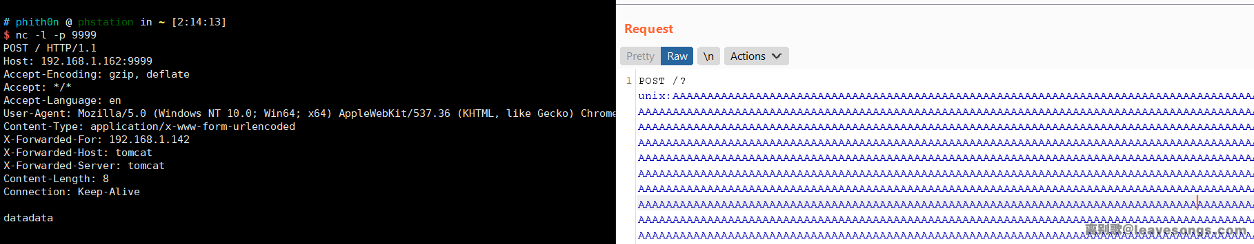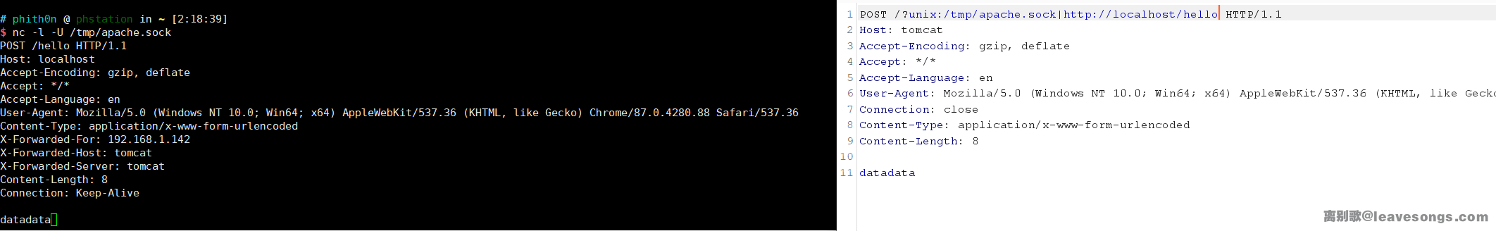 另一个,这个SSRF漏洞是否可以打本地的unix socket?答案是肯定的。原本这个漏洞的第一请求目标就是本地的unix套接字,我们使用4092个超长search绕过了这个限制让他可以打任意远程地址,只要让它回归原本的方法就可以打本地的unix套接字了: