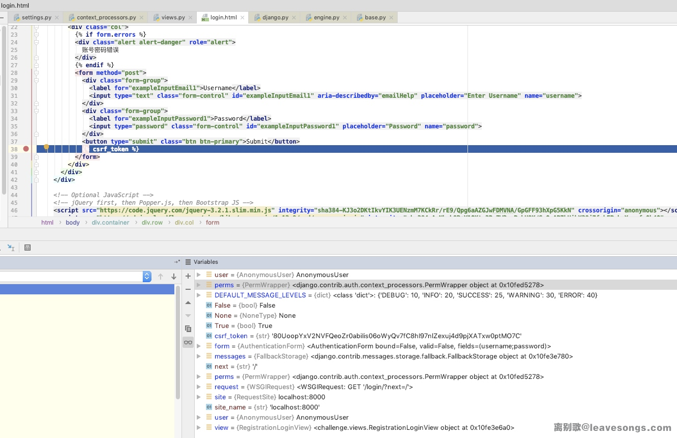 我们随便打开一个模板,然后在其中带有模板标签的地方下个断点,如registration/login.html中的{% csrf_token %}: