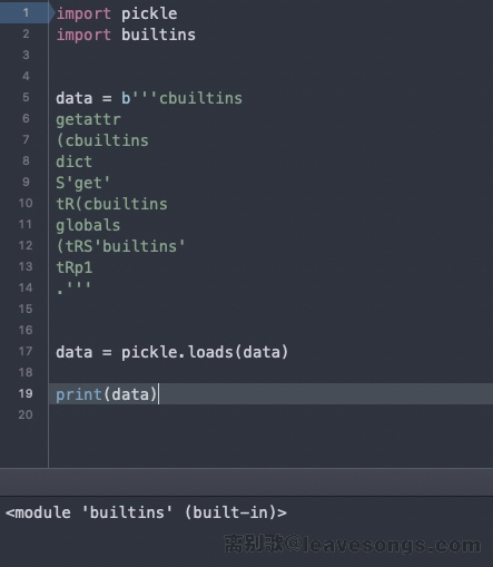 回到我们的目标代码,可见,我的find_class中限制了反序列化的对象必须是builtins模块中的对象,但不能是{'eval', 'exec', 'execfile', 'compile', 'open', 'input', '__import__', 'exit'}。