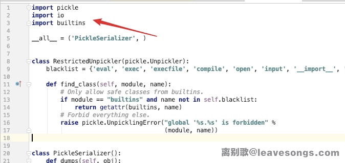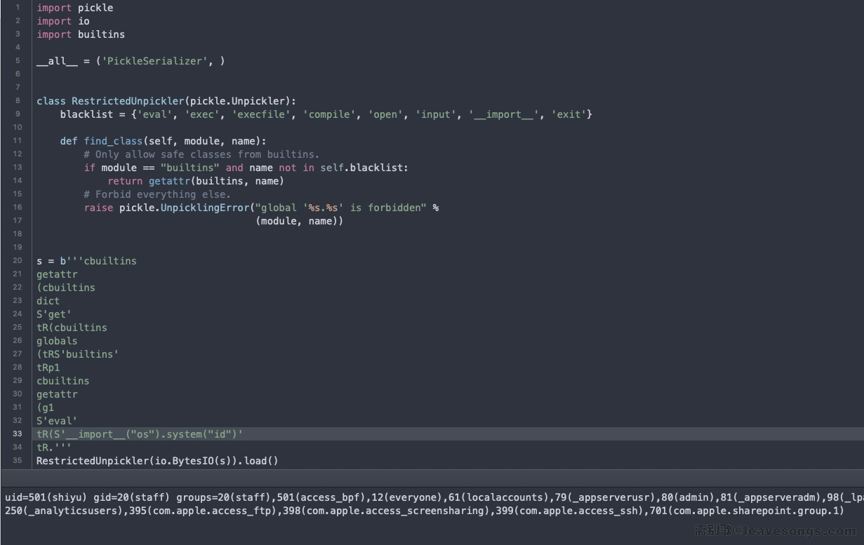 对Python熟悉的同学应该很清楚,通常我们反序列化只需要执行pickle.loads即可,但这里使用了RestrictedUnpickler这个类作为序列化时使用的过程类。