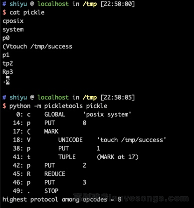 0: c GLOBAL 'posix system' # 向栈顶压入`posix.system`这个可执行对象 14: p PUT 0 # 将这个对象存储到memo的第0个位置 17: ( MARK # 压入一个元组的开始标志 18: V UNICODE 'touch /tmp/success' # 压入一个字符串 38: p PUT 1 # 将这个字符串存储到memo的第1个位置 41: t TUPLE (MARK at 17) # 将由刚压入栈中的元素弹出,再将由这个元素组成的元组压入栈中 42: p PUT 2 # 将这个元组存储到memo的第2个位置 45: R REDUCE # 从栈上弹出两个元素,分别是可执行对象和元组,并执行,结果压入栈中 46: p PUT 3 # 将栈顶的元素(也就是刚才执行的结果)存储到memo的第3个位置 49: . STOP # 结束整个程序
