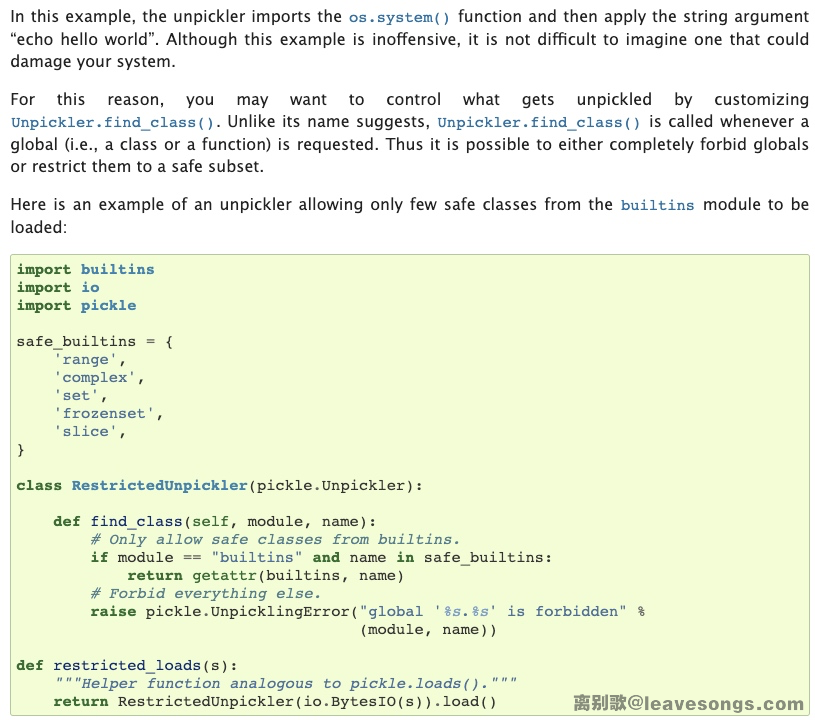 其实这就是官方文档给出的一个优化Python反序列化的方式,我们可以给反序列化设置黑白名单,进而限制这个功能被滥用: