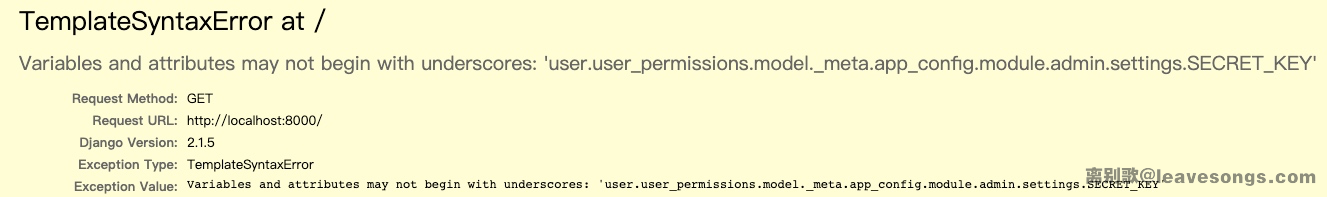 但是和格式化字符串漏洞不同,Django的模板引擎有一定限制,比如我们无法读取用下划线开头的属性,所以,前文里说到的{user.user_permissions.model._meta.app_config.module.admin.settings.SECRET_KEY}这个方法是不能使用的。
