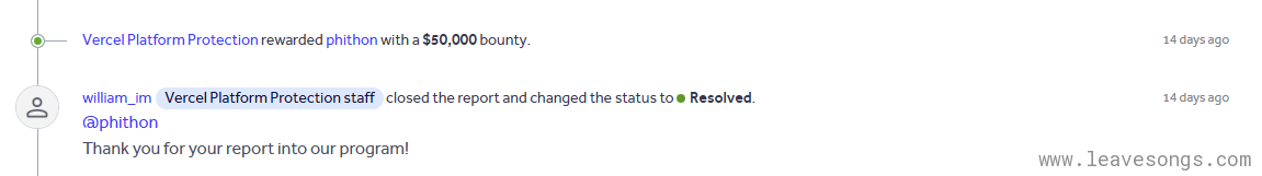 分享完后我就睡觉了,第二天中午才起床,起床就发现Vercel发布了赏金活动,而且奖金居然高达5万美元。我迅速将昨晚的研究成果整理了一下提交到hackerone,但当时我已经不报太大希望,毕竟这个方法我都公开在星球和X上至少10个小时了。