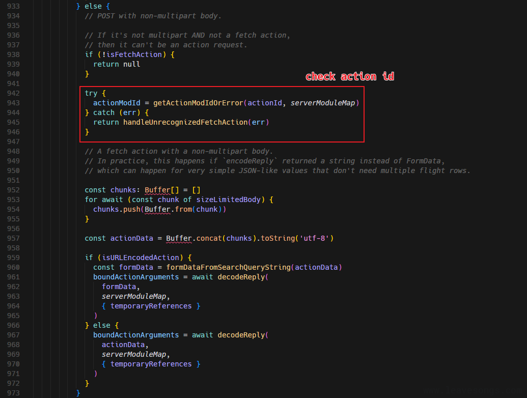 但是之所以认为漏洞的利用必须是Multipart数据包,原因是非Multipart的情况下Next.js会检查Next-Action中指定的action id是否存在: