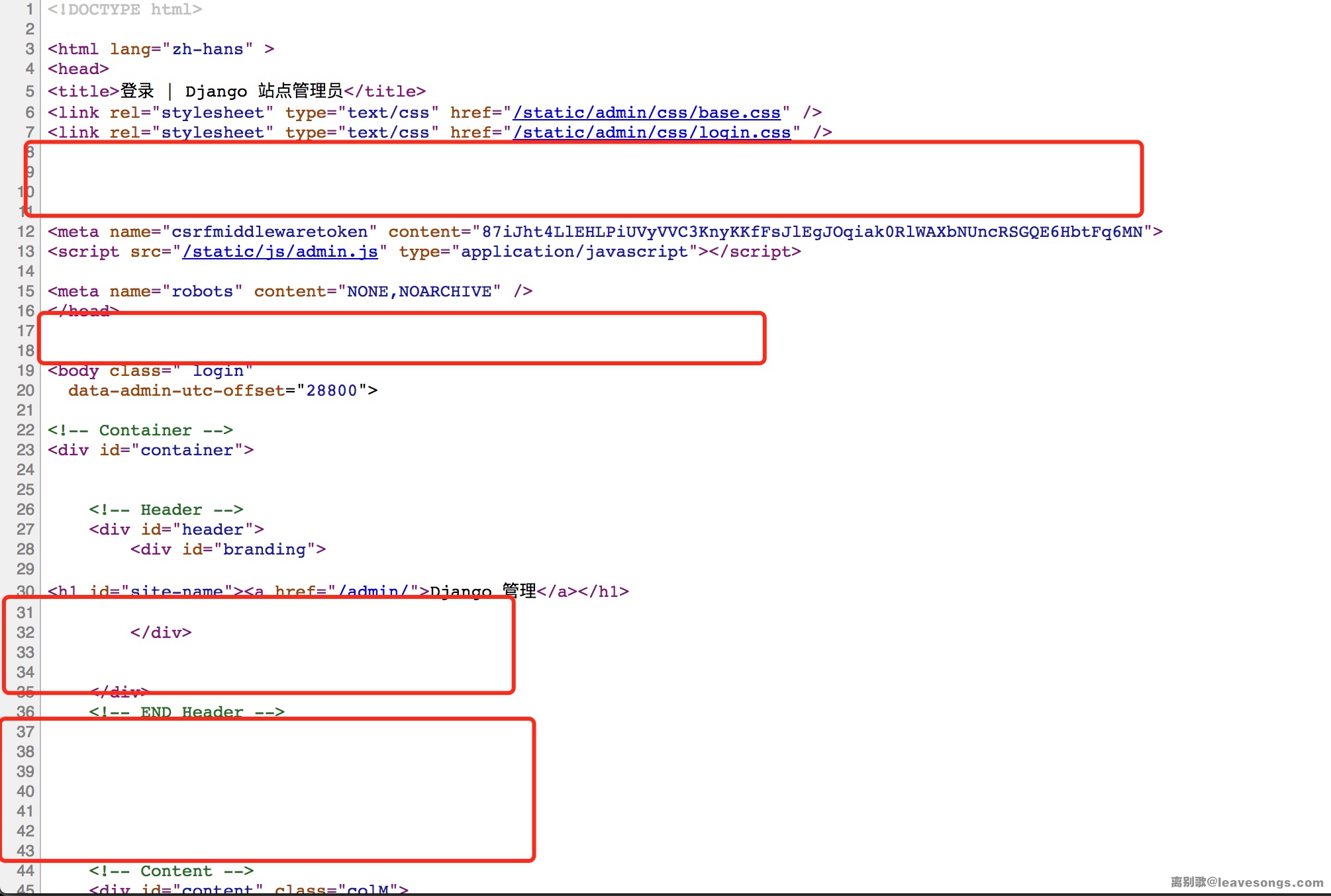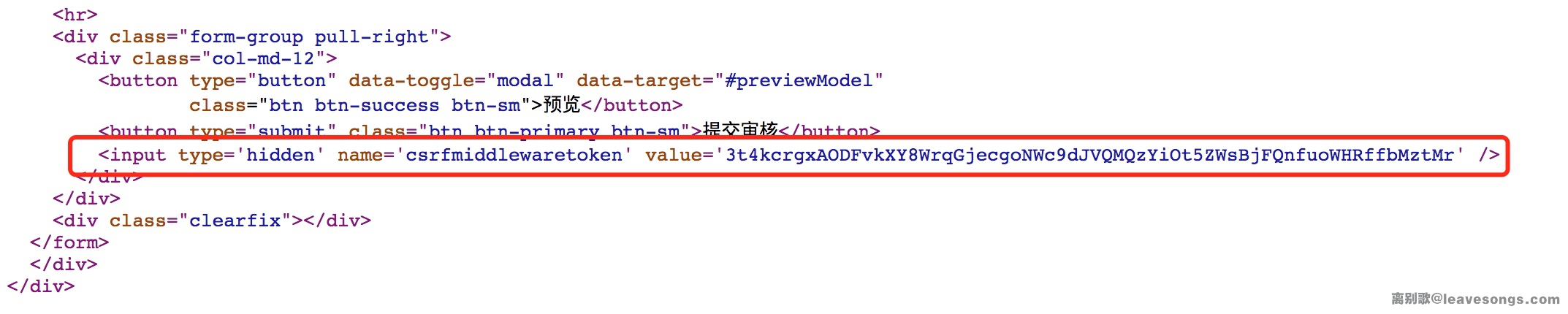 访问一个包含表单的页面,表单中会有一个隐藏的input,用来做CSRF检测的Token,其名字比较独特,csrfmiddlewaretoken: