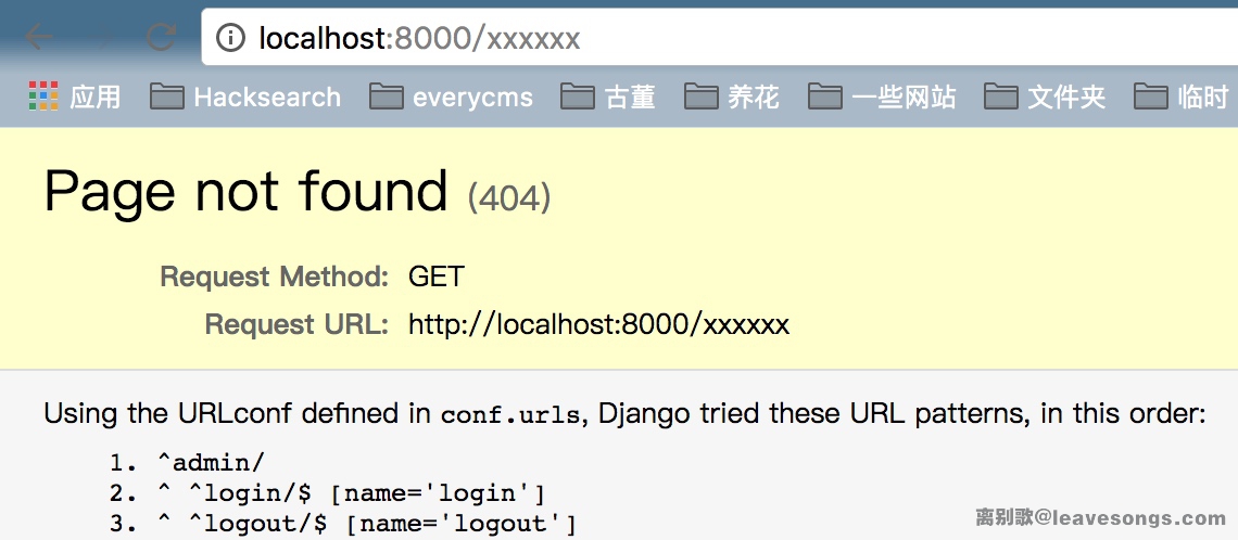 DEBUG模式开启时,访问不存在的页面或出错的页面会有特殊的异常抛出。像这样的页面,就可以确定是Django