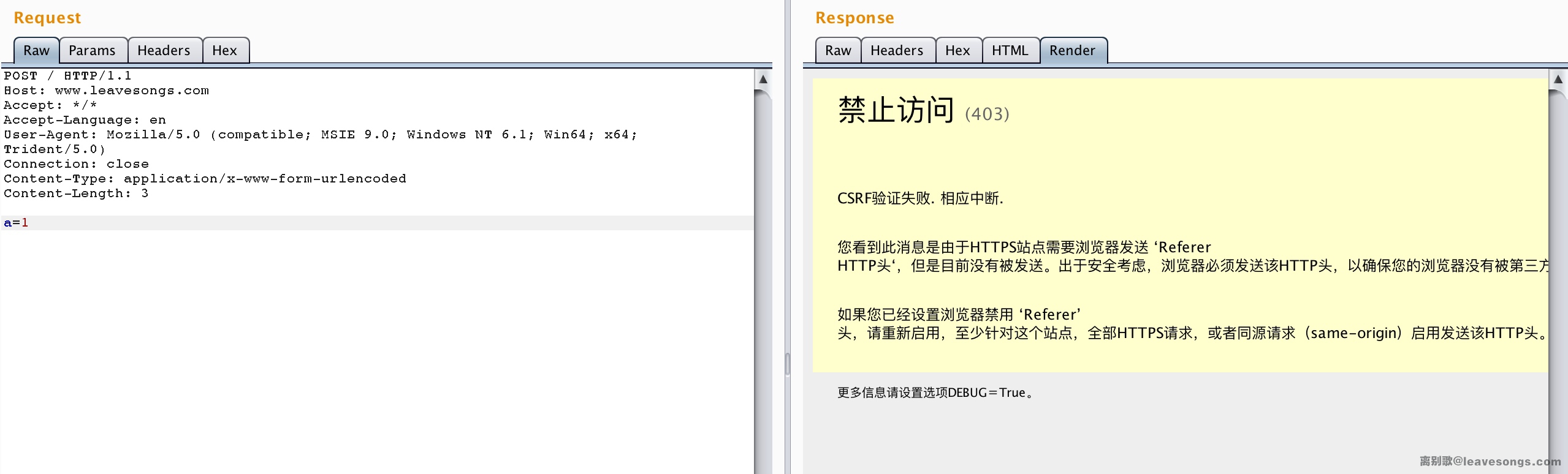 随便向目标的某个页面POST一个数据包,因为缺少CSRF TOKEN,如果目标网站是Django,它将给你一个颇具其特色的错误页面: