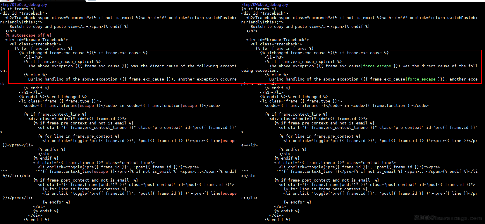如果要触发这两个输出点,就必须进入这个if语句:{% ifchanged frame.exc_cause %}{% if frame.exc_cause %}。