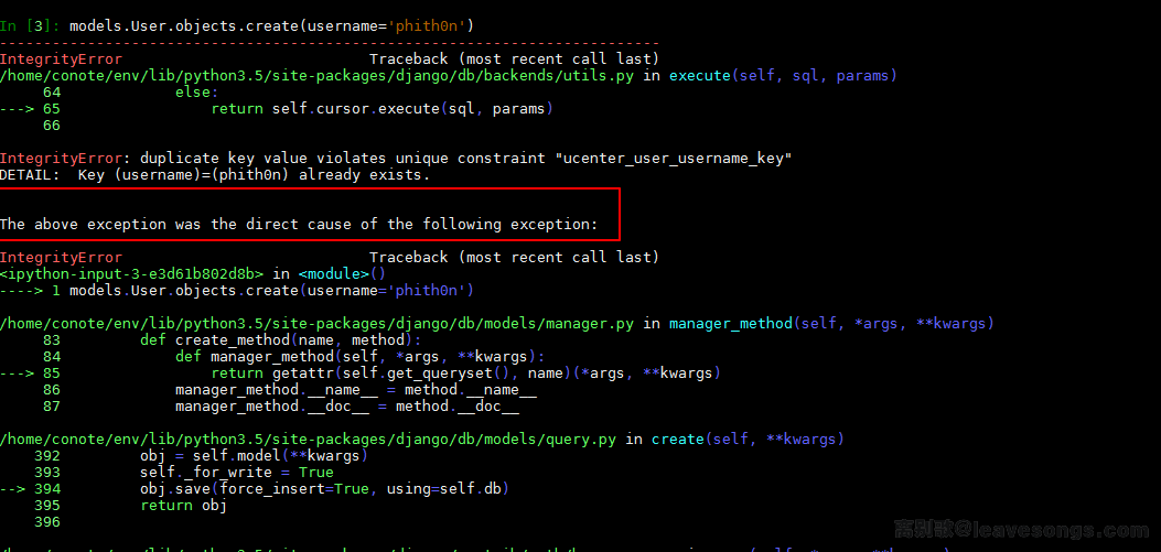 我们可以做个简单的测试,在Django命令行下,我们创建一个username为phith0n的用户,然后再次创建一个username为phith0n的用户,则会抛出一个IntegrityError异常: