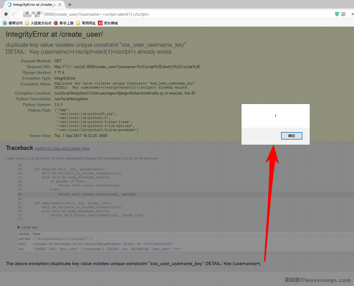 访问http://your-ip:8000/create_user/?username=<script>alert(1)</script>创建一个用户,成功;再次访问http://your-ip:8000/create_user/?username=<script>alert(1)</script>,触发异常:
