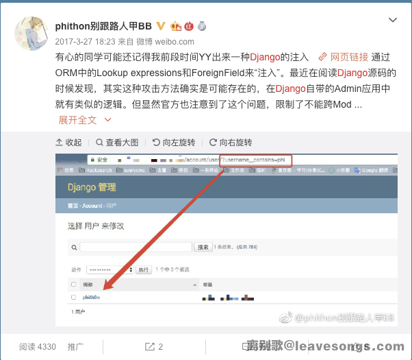 我也注意到了Django-Admin中支持用户控制queryset的查询键名,但从没想过可以利用这一点来搞注入。