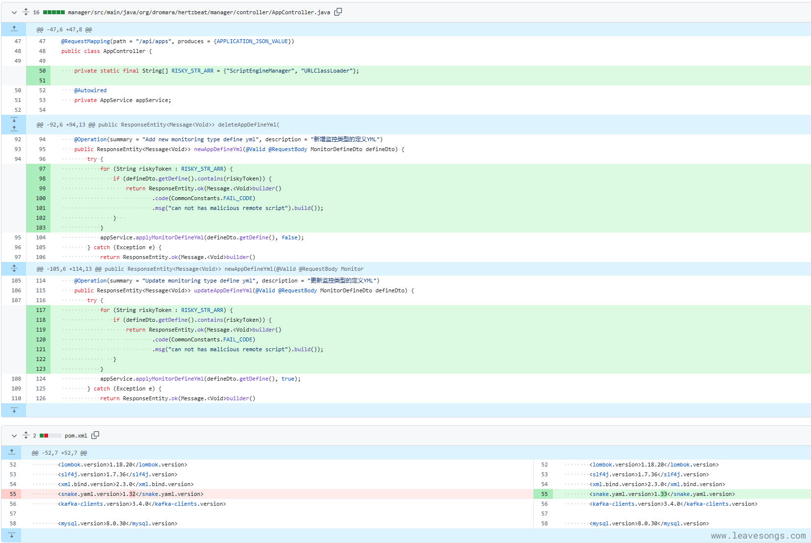HertzBeat在解析YAML的时候使用了SnakeYAML,而SnakeYAML在满足如下两个条件时,将会存在反序列化漏洞(CVE-2022-1471):