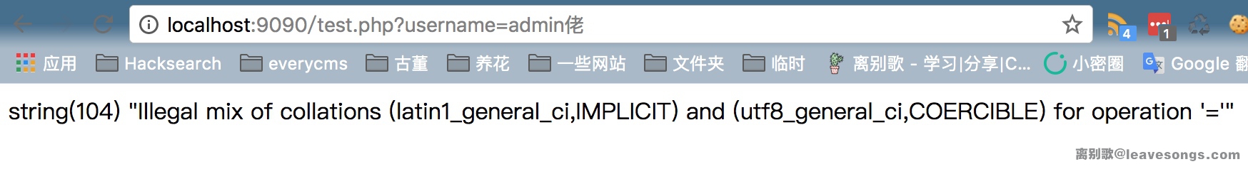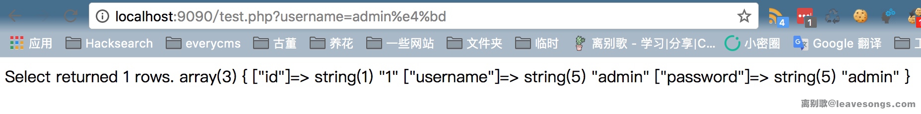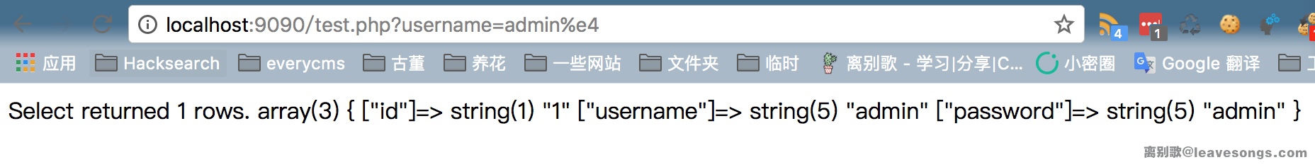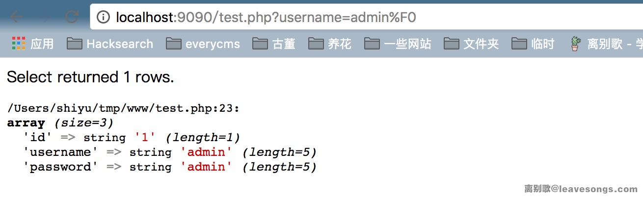 然后,我们访问http://localhost/test.php?username=admin%c2,即可发现%c2被忽略,Mysql查出了username=admin的结果: