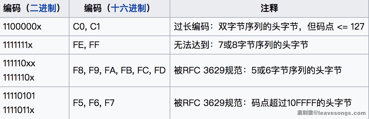 然后根据RFC 3629规范,又有一些字节值是不允许出现在UTF-8编码中的: