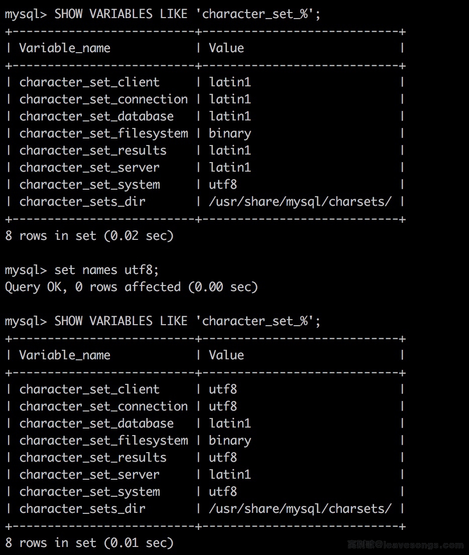 set names utf8 的意思是将客户端的字符集设置为utf8。我们打开mysql控制台,依次执行SHOW VARIABLES LIKE 'character_set_%';、set names utf8;、SHOW VARIABLES LIKE 'character_set_%';,即可得到如下结果:
