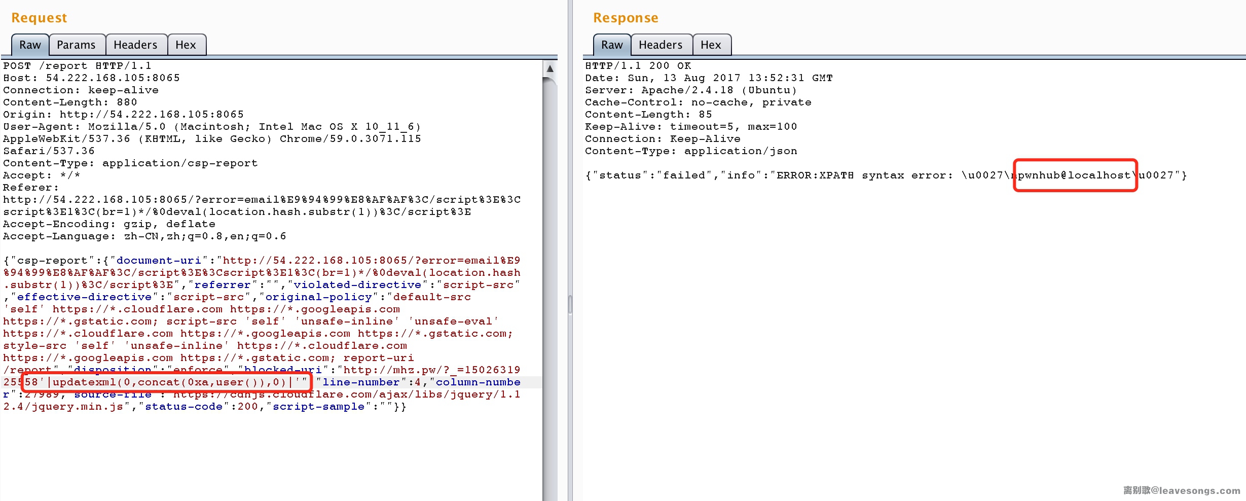 这个请求其实是有注入的,注入点在document-uri、blocked-uri、violated-directive这三个位置都有,随便挑一个: