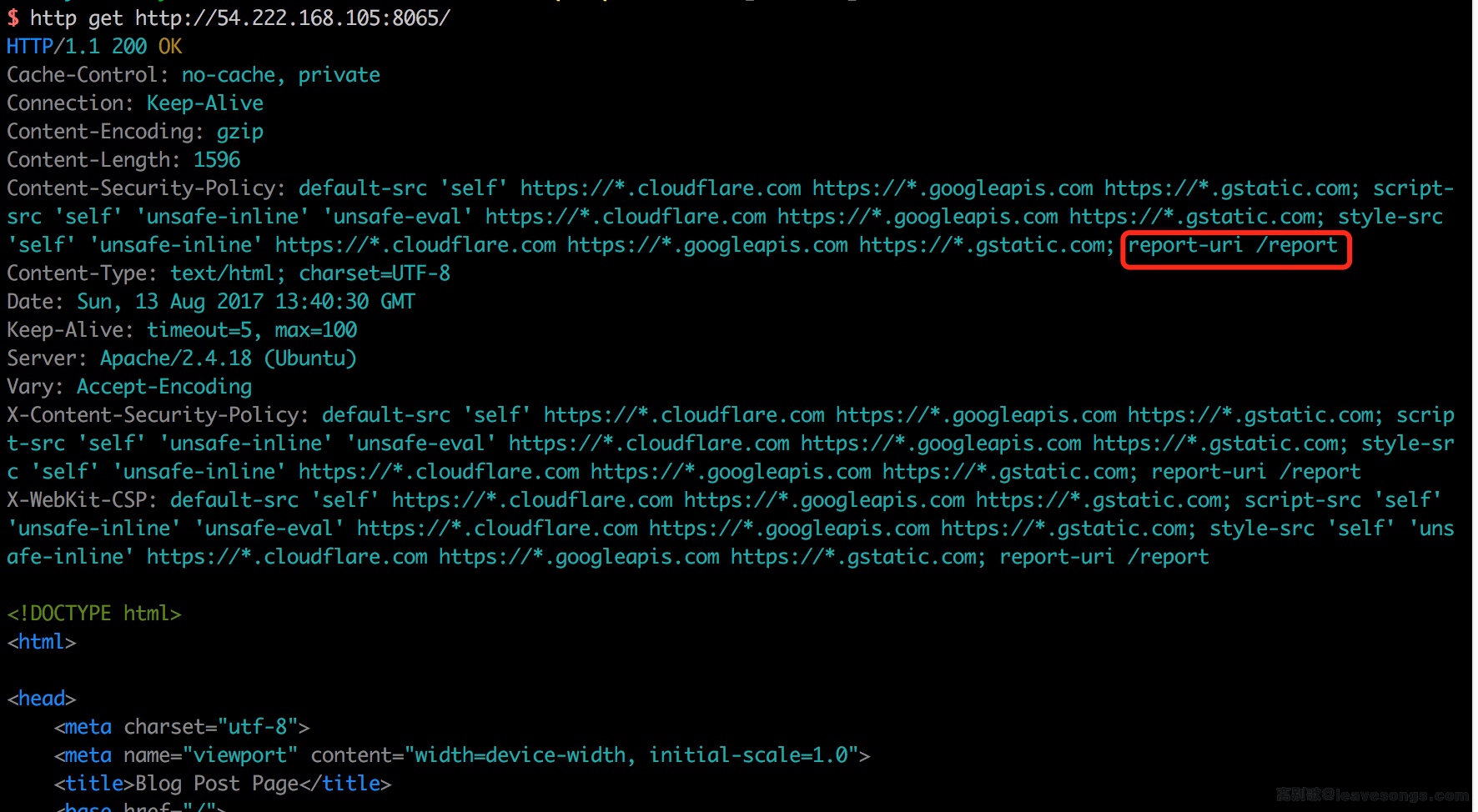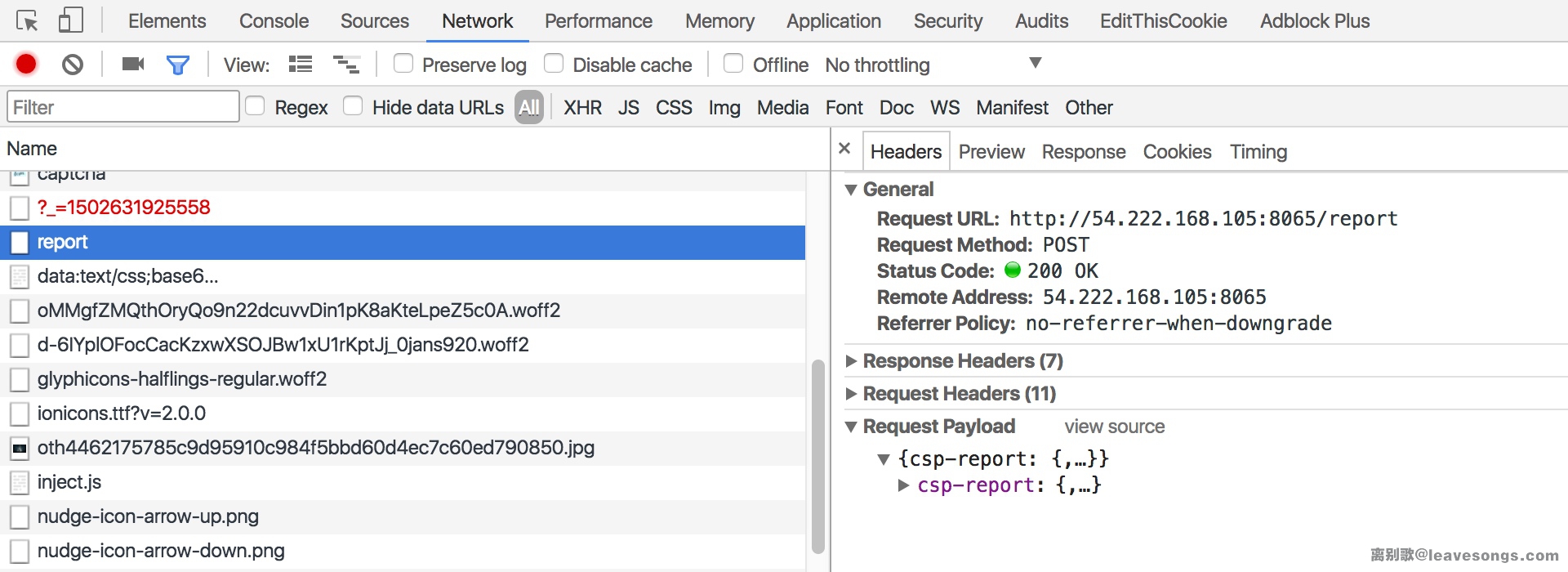 report-uri是CSP中的一个功能,当CSP规则被触发时,将会向report-uri指向的地址发送一个数据包。其设计目的是让开发者知道有哪些页面可能违反CSP,然后去改进他。