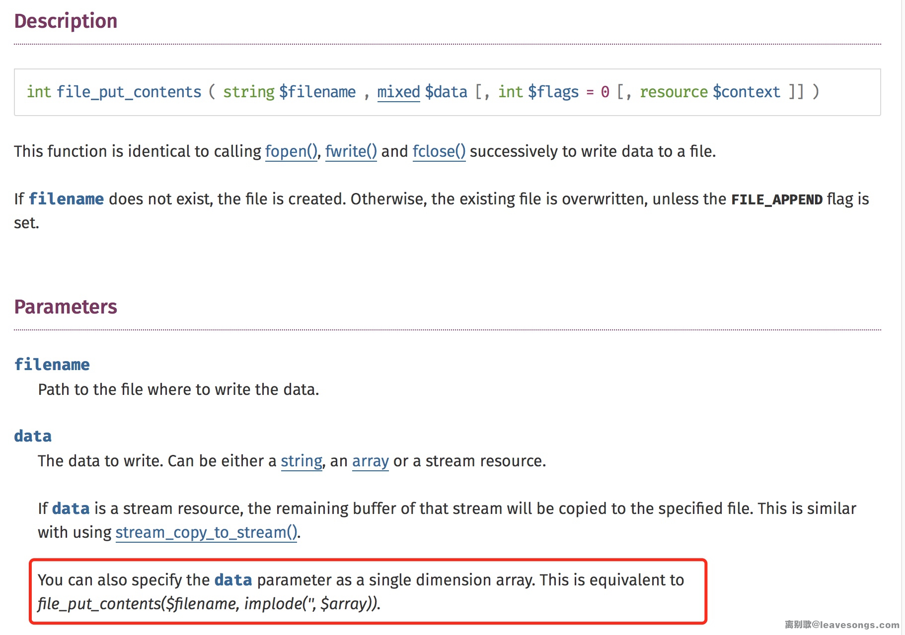 这就考到PHP的一个小Trick了,我们看看file_put_contents的文档即可发现: