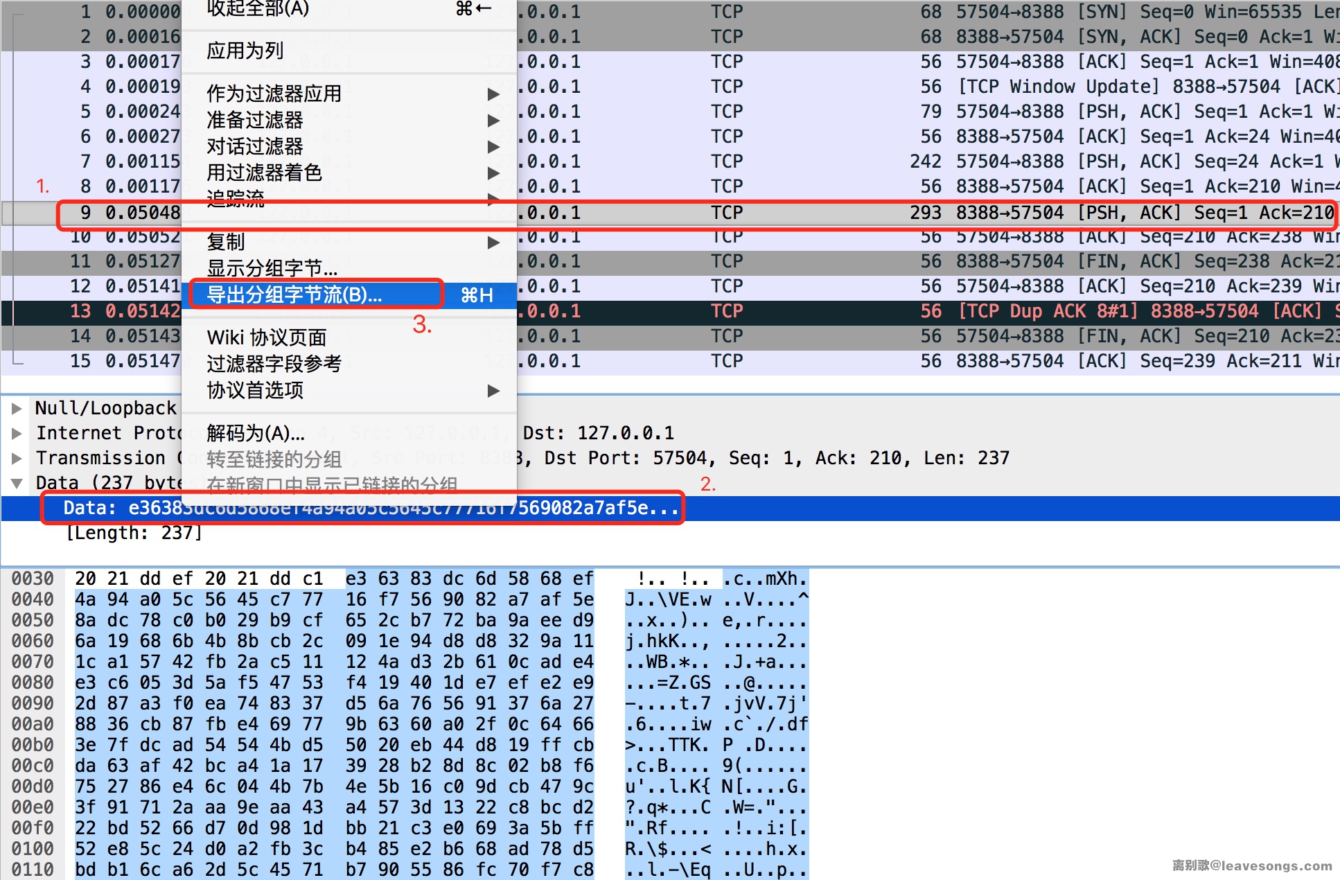 其实题干很简单,就是给了个数据包,下载以后用Wireshark打开即可。因为考虑到线下沙龙时间较短,所以我只抓了一个TCP连接,避免一些干扰。