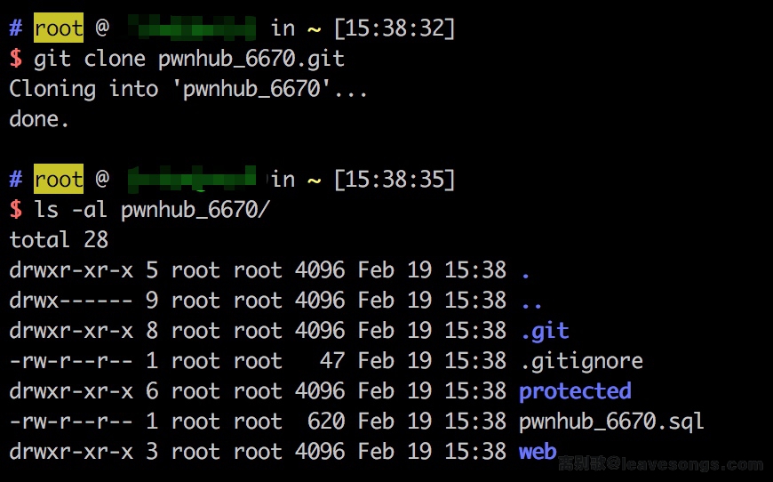 Git支持通过本地文件、SSH、HTTPS或GIT协议拉取信息。我们既然已经用rsync将裸仓库下载到本地了,所以只需要git clone pwnhub_6670.git即可将裸仓库拉取下来,成为一个标准的仓库: