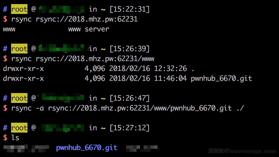 可见,这是一个rsync服务,我们使用rsync命令查看目录,发现只有一个目录,名为pwnhub_6670.git,将其拉取下来: