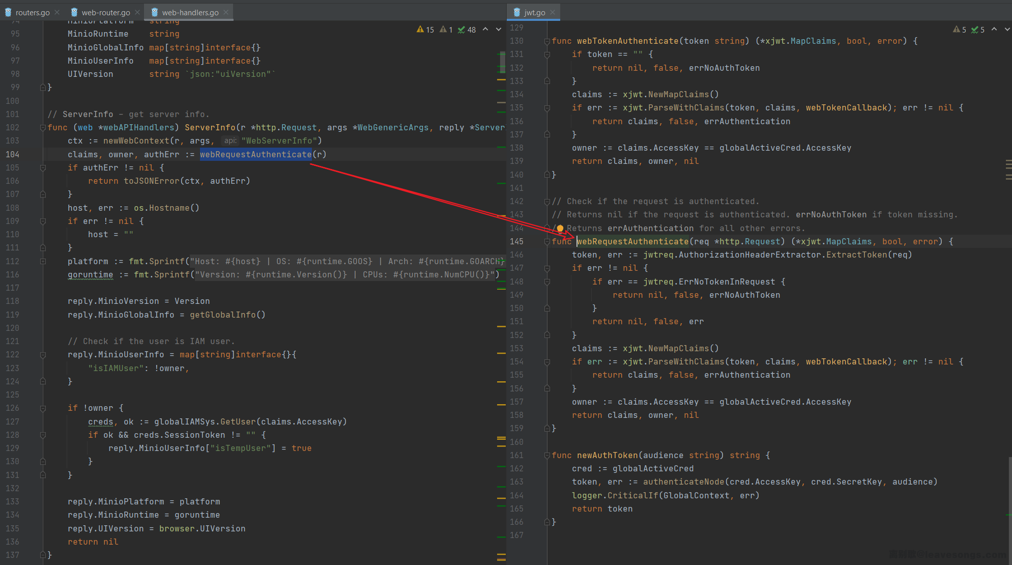 我们感兴趣的就是其鉴权的方法,随便找到一个RPC方法,可见其开头调用了webRequestAuthenticate,跟进看一下,发现这里用的是jwt鉴权: