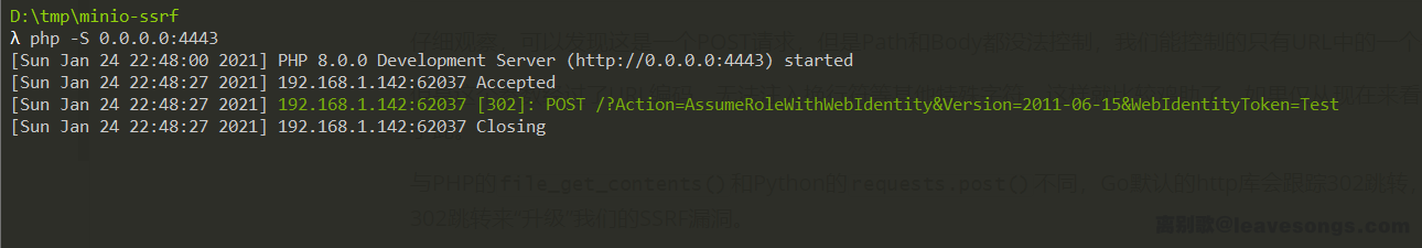 还记得我们是怎样获得这个GET型的SSRF的吗?通过302跳转,而接受第一次跳转的请求就是一个POST请求。不过我们没法直接利用这个POST请求,因为他的Path不可控。