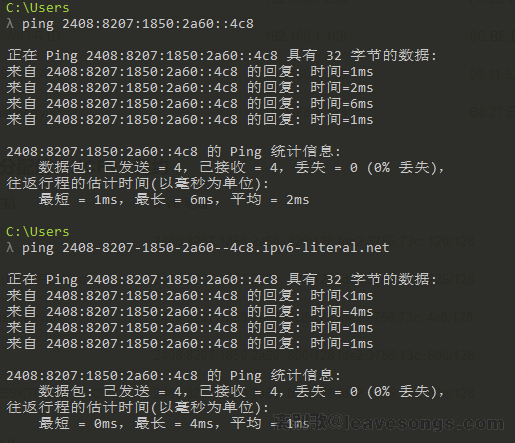 而UNC Path是不支持冒号的,所以我们没法在UNC Path中使用IPv6地址:\\[fe80::2]\share。所以微软官方想了一个歪招,他们注册了一个域名ipv6-literal.net,然后在Windows系统中,将IPv6地址中的冒号换成横线作为ipv6-literal.net子域名,如2408-8207-1850-2a60--4c8.ipv6-literal.net。