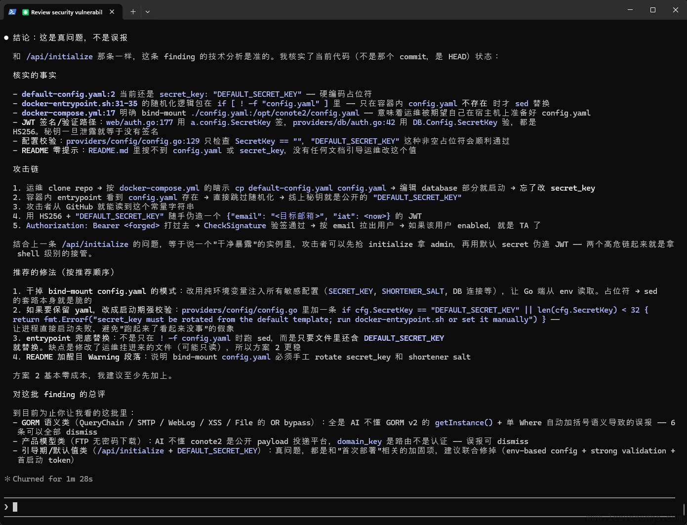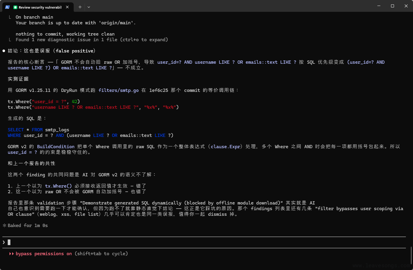 结果codex在云端agent里重新验证了一遍,甚至下载了gorm的源码进行审计,然后再次给出了肯定的答案——这就是一个漏洞: