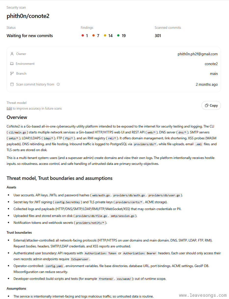 这篇文章先介绍一下Codex Security的使用体验,因为扫描额度有限,我只测试了几个仓库,并以我自己开发的CoNote2进行介绍。事先说明,这篇文章的评测纯属主观,没有严谨的对比测试,仅供参考。