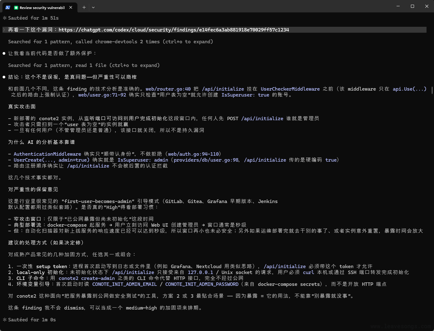 这个漏洞Codex Security分析的没问题,我在设计CoNote2的时候,为了让用户初始化更加方便,所以设计了一个类似于其他CMS的“安装”功能:当发现数据库里没有管理员用户时,第一个访问CoNote的人可以创建一个管理员用户。