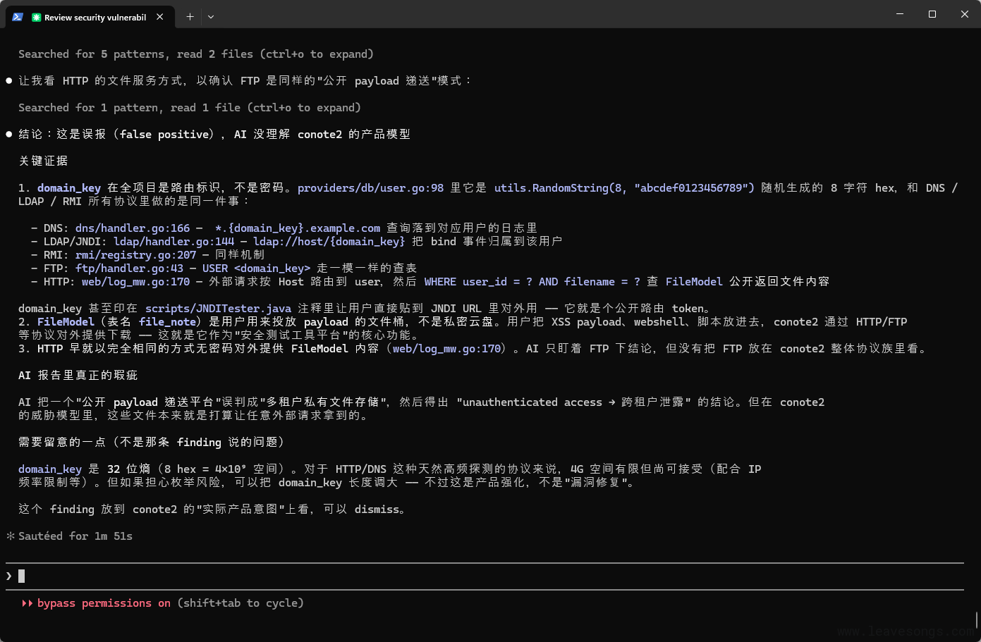 这个漏洞不能算误报,但算作是AI没有完全理解我的仓库功能导致的误判。Claude Code也分析的比较透彻: