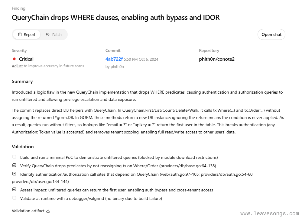 这份报告里唯一一份严重漏洞是“QueryChain drops WHERE clauses, enabling auth bypass and IDOR”: