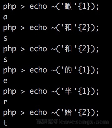 方法二利用的是UTF-8编码的某个汉字,并将其中某个字符取出来,比如'和'{2}的结果是"\x8c",其取反即为字母s