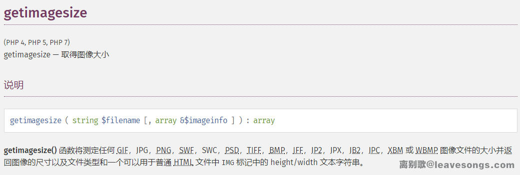 通过翻阅PHP文档,可知getimagesize支持的图片类型有 GIF,JPG,PNG,SWF,SWC,PSD,TIFF,BMP,IFF,JP2,JPX,JB2,JPC,XBM,WBMP: