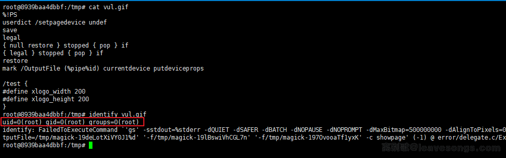 用存在漏洞的imagemagick+GhostScript进行测试,命令成功执行: