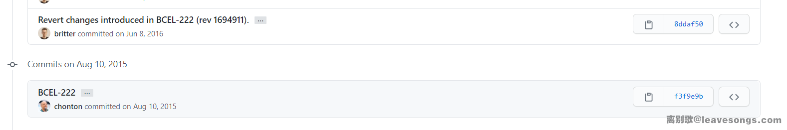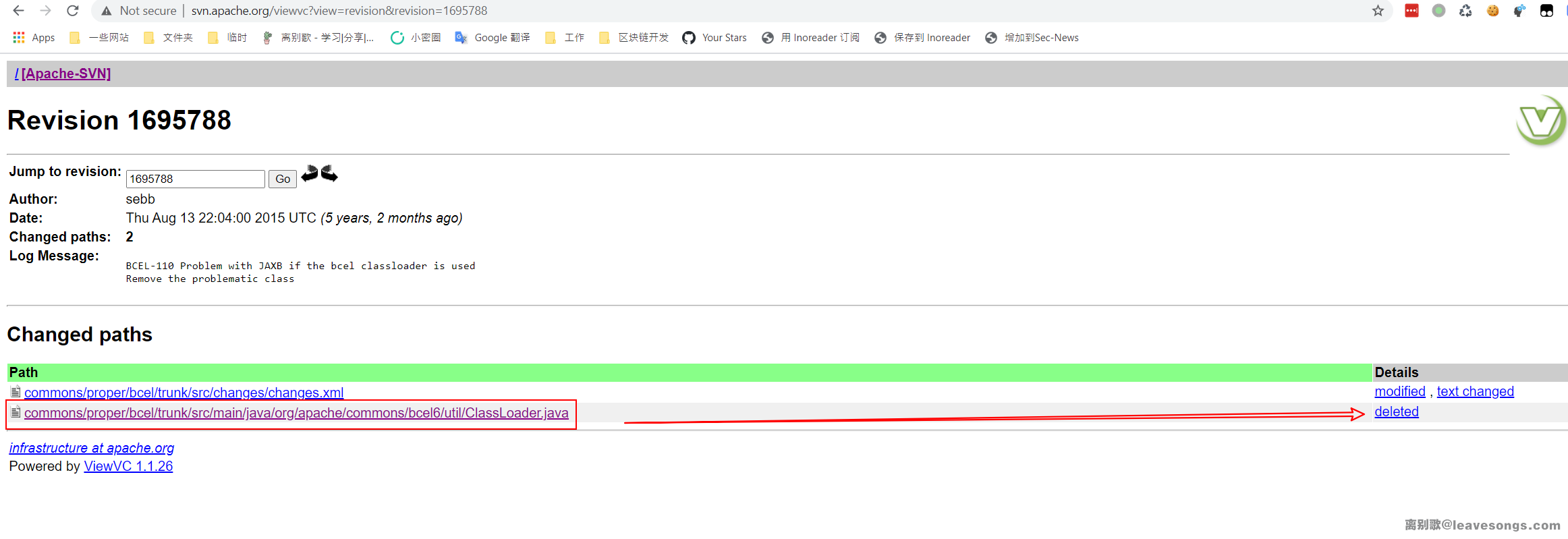 这时注意了,仔细查看之前的ClassLoader.java被删除的那条记录你会发现,删除的时候是在2015年8月,且目录中的文件夹名字是bcel6。也就是说,刚好是被改后的这段时间,然而因为2016年那次的revert ,这个改动也被撤回了……